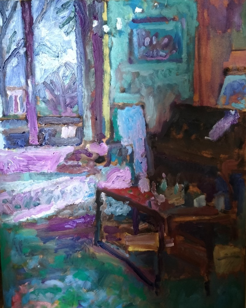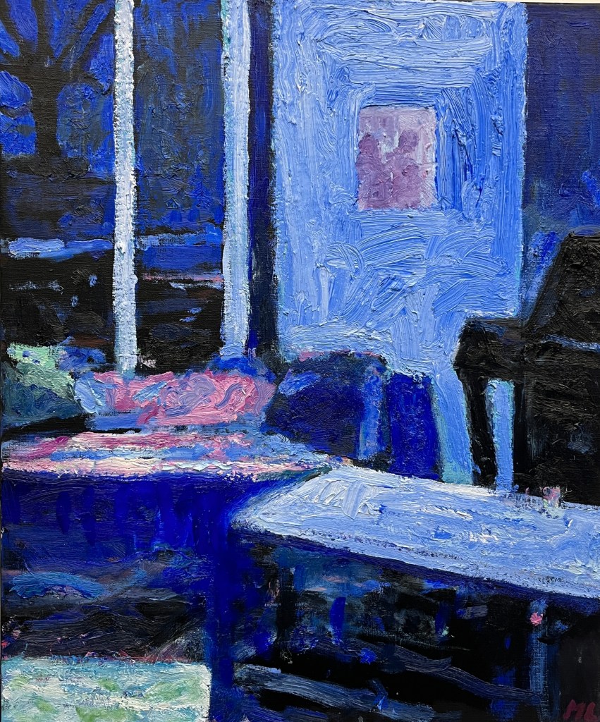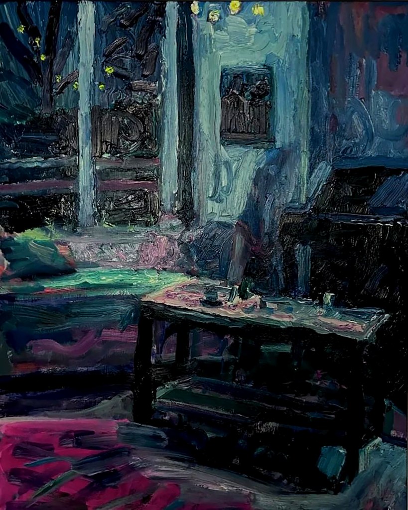 My Christmas room, huile sur bois, 40 x 40 cmDimanche soir au chaud, huile sur toile de lin, 41 x 23 cmLe piano bar, huile sur toile de lin, 54 x 65 cm ( indisponible) Salon, la nuit, huile sur toile de lin, 88 x 116 cmSalon jazzy, huile sur panneau, 58 x 85 cm ( indisponible)Salon au soir, huile sur panneau, 60 x 88 cm ( indisponible)